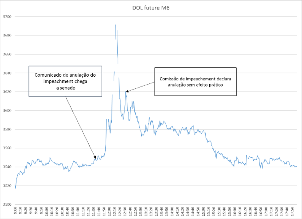 Uma pequena digressão para efeitos de contextualização: a votação do impeachment foi o evento culminante de um longo processo político de enorme repercussão sobre os mercados financeiros no Brasil (ver carta de abril). No mercado de câmbio, em particular, a moeda se valorizara fortemente nos meses que antecederam a votação. A notícia da anulação, contudo, parece ter pego a maior parte dos agentes desprevinidos e repercutiu como uma bomba nos mercados. O que se seguiu foi um pandemônio que, em intensidade, período e comportamento, muito se assemelhou ao flash-crash das bolsas americanas. Diferente daquele, o crash brasileiro teve um fator desencadeante que permite que se balize o evento no tempo.