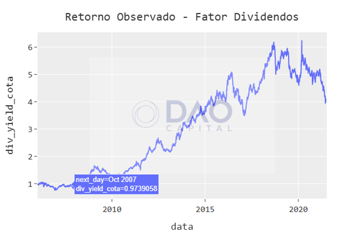 - de junho de 2016 a fevereiro de 2017 (pós-impeachment) o investidor que tivesse uma exposição ao prêmio de dividendos teria um primeiro grande susto, com uma queda de 30% no seu patrimônio, mas que recuperaria até novas máximas em 2018; e