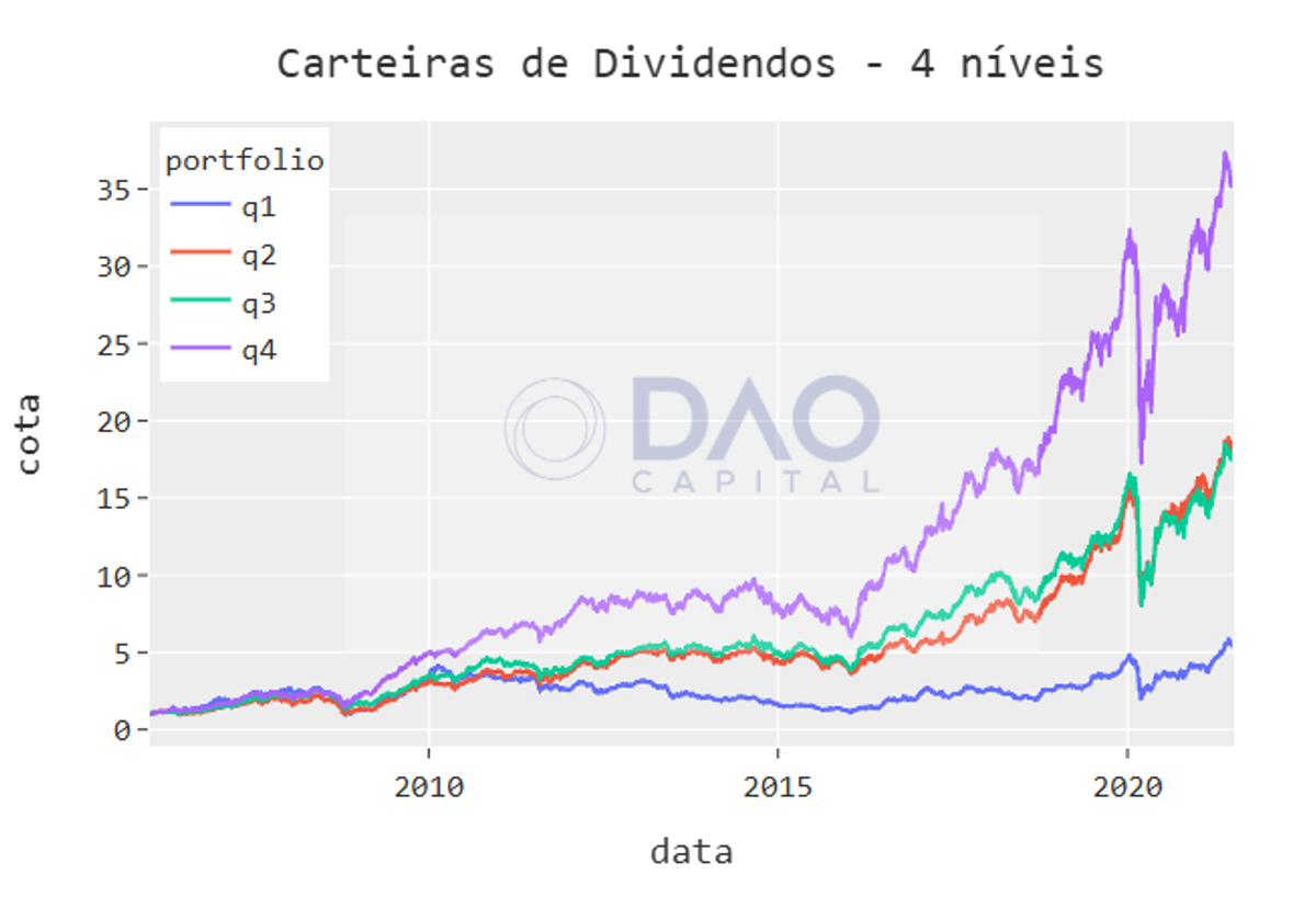 No nosso caso, então, queremos testar se investir em dividendos é uma boa ideia (hipótese). Para isso, construímos 4 portfólios ao longo do tempo em que a única caracteristica determinante é o dividendo oferecido para o acionista, ajustado pelo preço da ação (também conhecido como dividend yield). Assim, no portfólio Q1 estão sempre os 25% de empresas com os menores dividend yield da bolsa brasileira; no portfólio Q4 estão sempre os 25% que mais pagam dividendos. E os portfólios Q2 e Q3 são os portfólios intermediários, com base no mesmo critério de dividend yield.