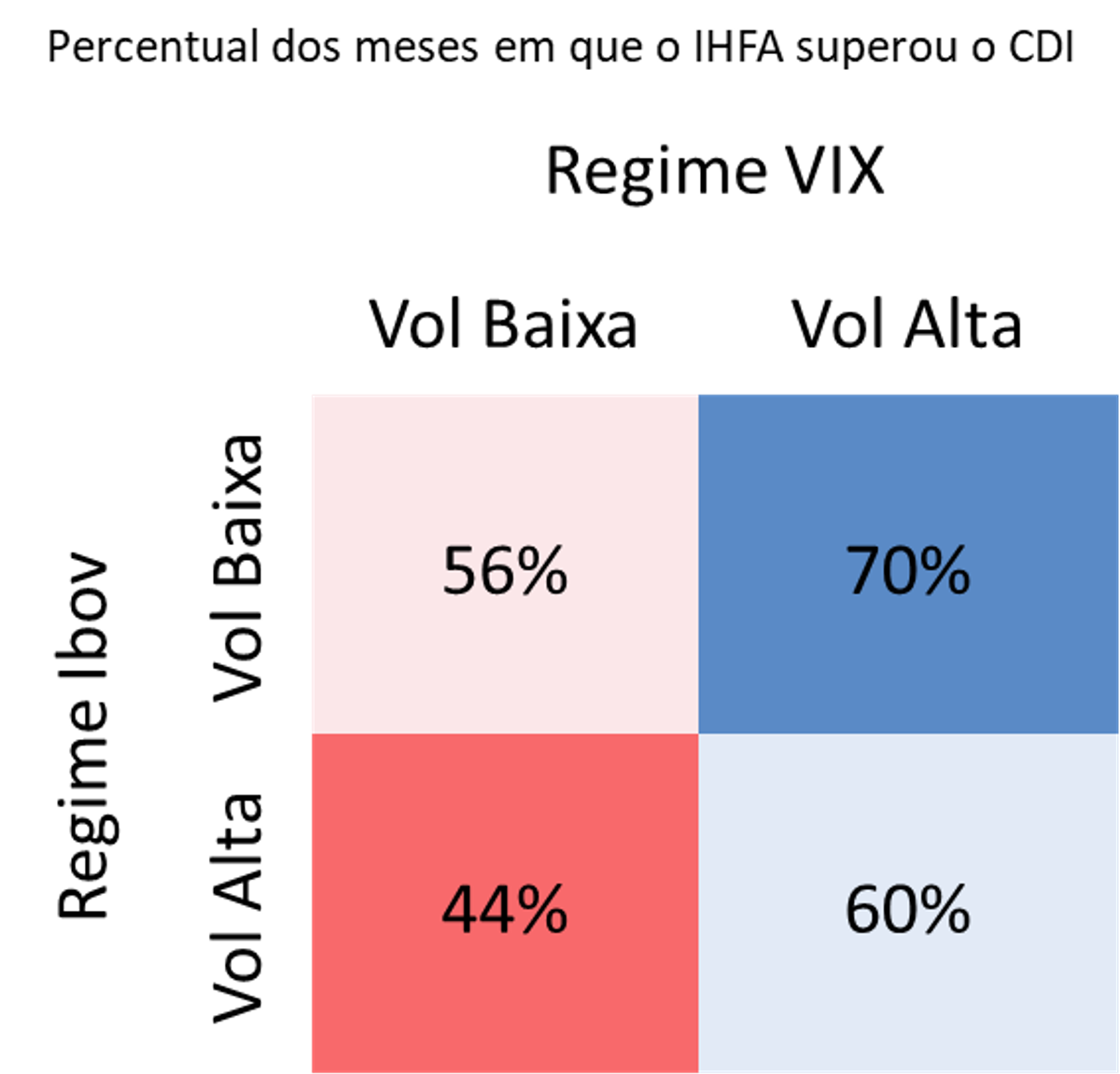 Finalmente, a imagem abaixo exibe o desempenho mensal dos fundos brasileiros em relação ao CDI quando consideramos a segmentação simultânea entre os regimes de volatilidade medidos tanto pelo Ibov, quanto pelo VIX. Os momentos mais positivos para os fundos costumam combinar baixa volatilidade no mercado brasileiro e alta volatilidade nos mercados internacionais. Nesses meses, o IHFA costuma superar o CDI em 70% das vezes. Por outro lado, quando a volatilidade é um fenômeno puramente local, os fundos superam o CDI em apenas 44% dos meses.