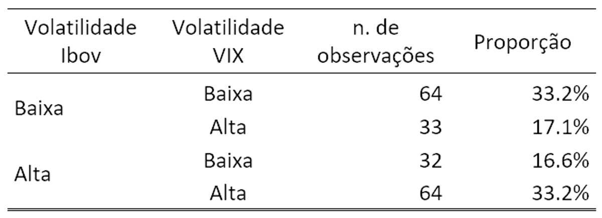 Após o cálculo, cada uma das métricas é separada pela sua mediana para definir o regime de volatilidade. Meses com valores acima da mediana são caracterizados como Vol Alta e abaixo, evidentemente, como Vol Baixa. No período analisado, a mediana de volatilidade do Ibov (anualizada) foi de 20,73%. Já para o VIX, o valor de corte foi de 17,95%.