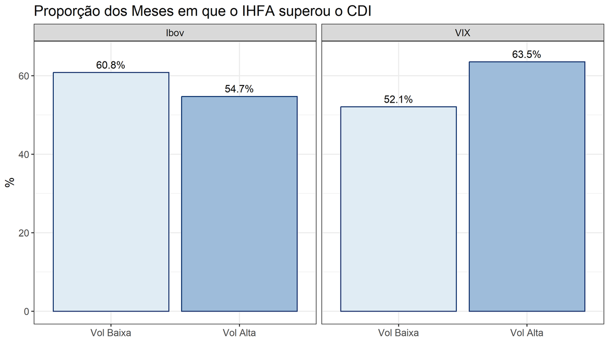 Em menor grau, o regime de alta volatilidade, tanto no VIX, quanto no Ibovespa, parece também ser marginalmente favorável aos gestores brasileiros, com o IHFA superando o CDI em 60% das vezes. E com resultado ainda positivo, só que em menor escala, os gestores tiveram performance superior ao CDI em 56% dos casos nos cenários de baixa volatilidade nos mercados locais e externo.