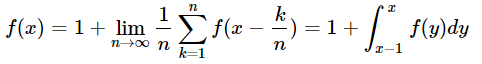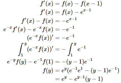 Derivando a expressão acima e substituindo o valor f(x-1) = e^(x-1) para 1 ≤ x ≤ 2, temos: