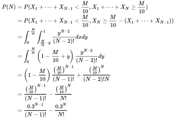 A soma de N variáveis uniformes possui a distribuição de Irwin-Hall, de forma que a função densidade de probabilidade vale x^(n-1)/(n-1)! se 0 ≤ x ≤ 1. Assim, a probabilidade de encher M canecas em N viagens, com M ≤ 10, vale: